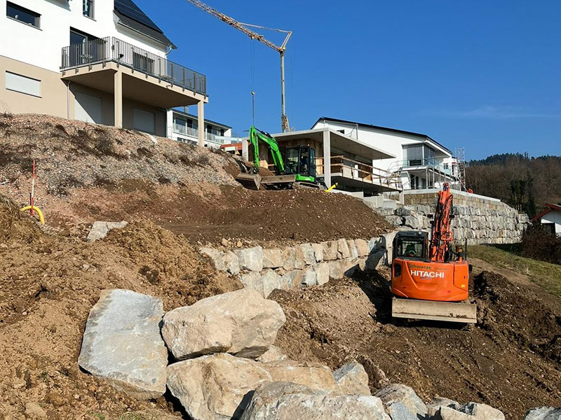 Wir bieten durchdachten und professionellen Landschaftsbau für Privatkunden, Unternehmen und öffentliche Auftraggeber im gesamten Kinzigtal, Ortenau und darüber hinaus. Ob naturnahe Hangbefestigung, langlebige Böschungssicherung oder stilvolle Natursteinlösungen - wir entwickeln Außenräume, die sowohl funktional als auch gestalterisch überzeugen. Unsere Spezialisierung liegt in der sicheren und stabilen Hangbefestigung – besonders wichtig in der bergigen Topografie des Schwarzwalds. Ob mit Mauerscheiben, Natursteinen oder Trockenmauern - wir finden für jede Situation die passende Lösung.